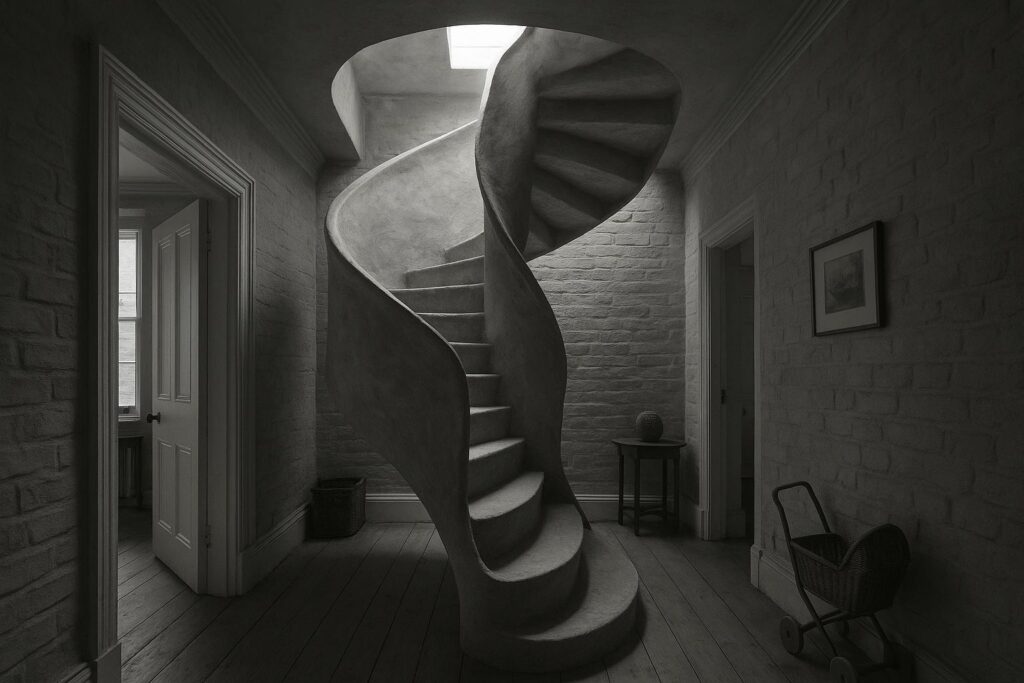 Michaelis Boyd made the stair the project’s sculptural heart: an organic, spiral form that intersects each floor and culminates in a double‑height void beneath a new skylight at attic level. According to the studio, the new central position of the stair also draws daylight into the house via reinstated sash windows and the top‑light, helping to animate the minimalist interior through natural light and shadow.