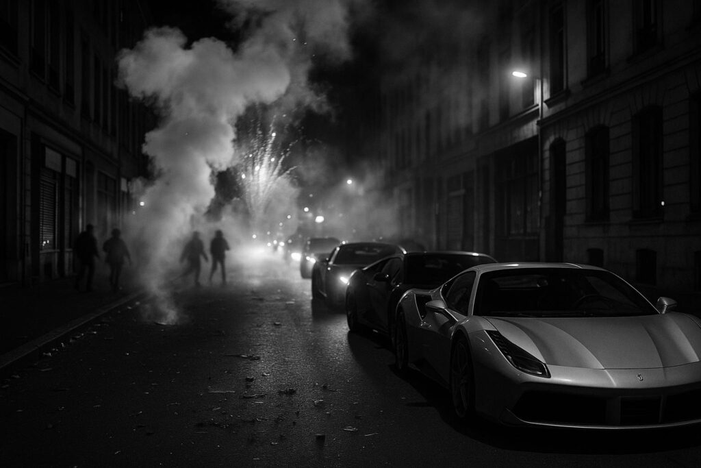 In the early hours of a recent morning, a group of men caused chaos in Tottenham, north London, by blocking off a street with high-end supercars and setting off fireworks at around 1am. The disturbance, reportedly linked to guests attending a nearby wedding, saw Ferraris and Mercedes G Wagons revving loudly while smoke bombs were also set off in the middle of the road, creating a dramatic and disruptive scene. The incident was captured on video, highlighting the audacity and intensity of the gathering.